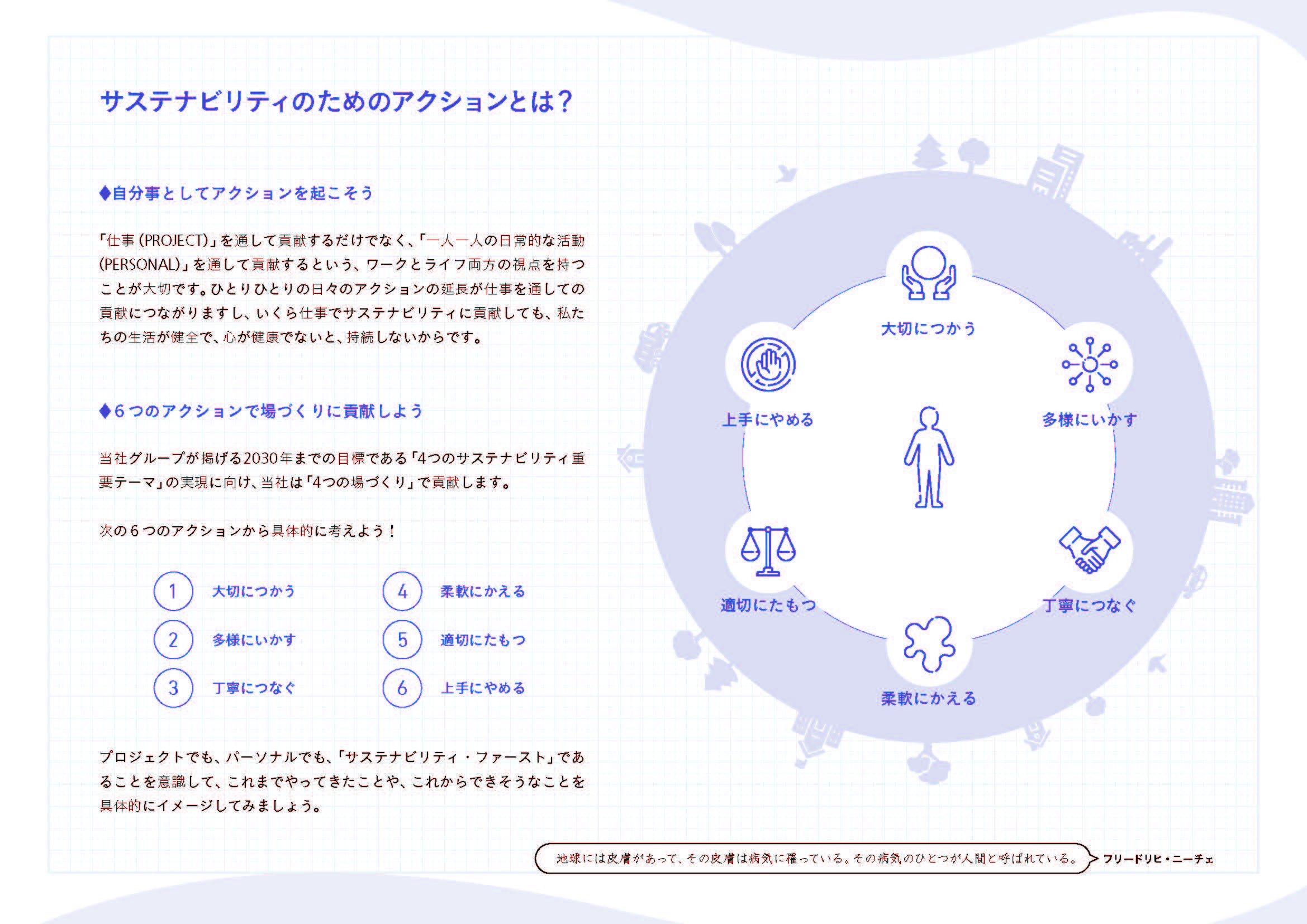 企業理念とサステナビリティの結びつきを強調し、社員に期待する「6つのアクション」を策定。これらのアクションは、仕事だけでなく、プライベートにおいてもサステナビリティを意識するためのもので、社員が主体的に考えるきっかけとなる問いや、「自分のSDGs」を考えるワークパートが設けられています。