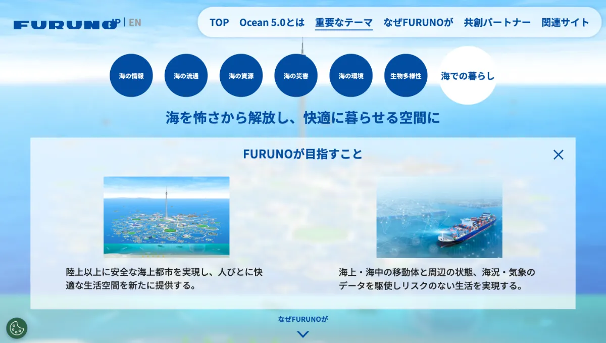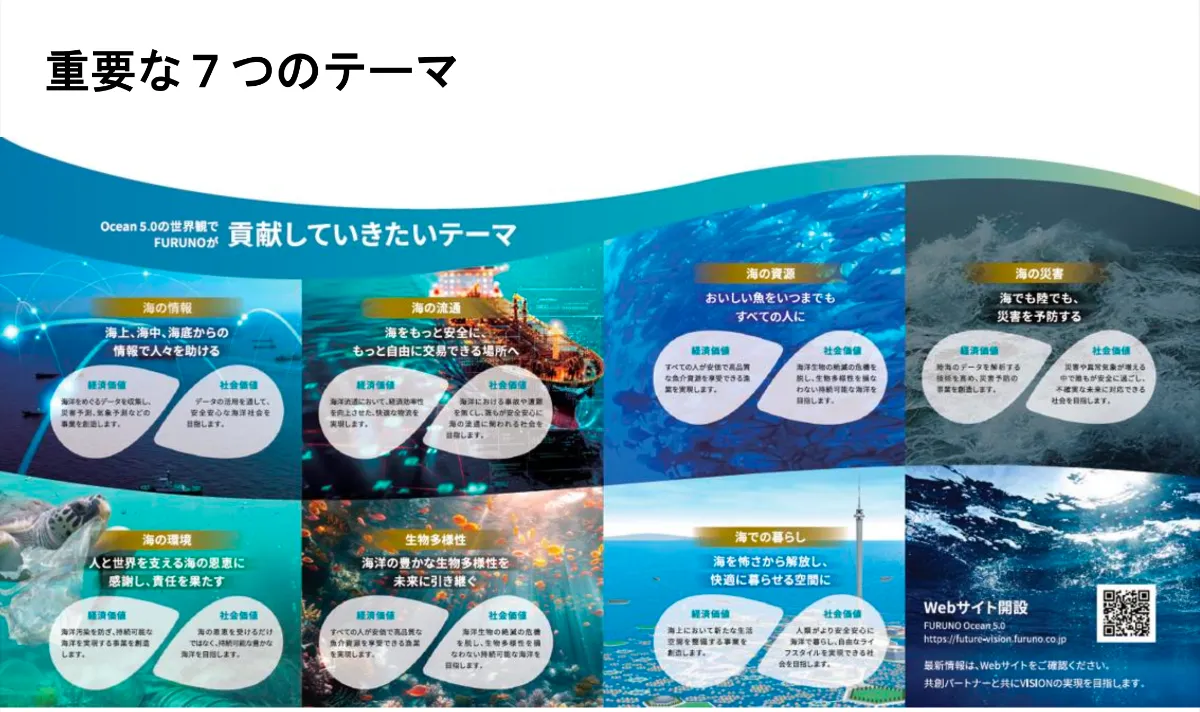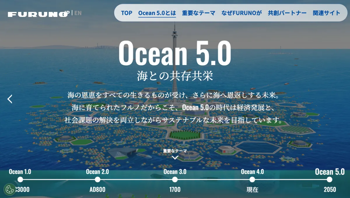 海の恩恵を発見し「海に進出した時代」を1.0、海を自由に航海できる「海を活用した時代」を2.0、人類を中心に考え「海を支配してきた時代」を3.0と定義。現在は4.0の時代であり、環境などに配慮して持続可能性を模索する「海を持続させる時代」と位置づけています。そして2050年の未来社会「Ocean 5.0」では、海の恩恵をすべての生きるものが受けることができ、海から恩恵をもらうだけでなく海へ恩返しする「海と共存共栄する時代」が訪れる——長きにわたって海とともにある古野電気だからこそ描ける、経済発展と社会課題の解決を両立させたビジョンとなりました。