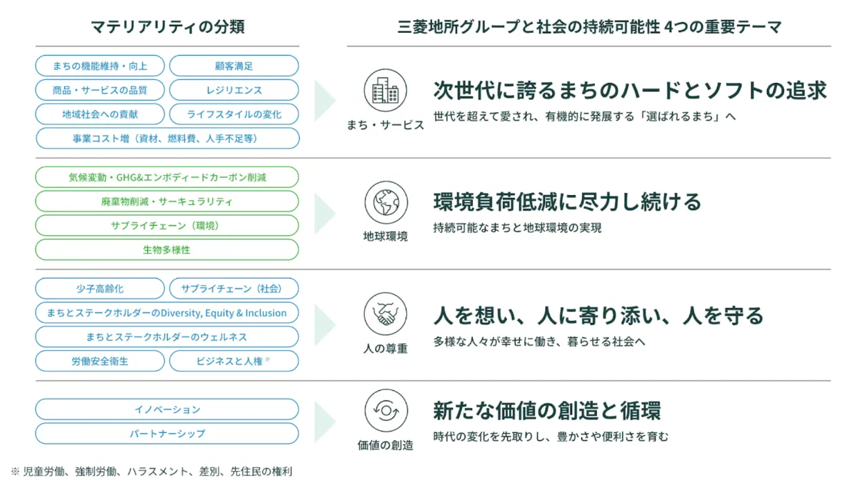 この重要課題を類似項目で整理し、「まちとサービス」「地球環境」「人の尊重」「価値の創造」の4つグループからなる重要テーマを選定。さらに、グループ内外に4つのテーマが浸透しやすくなるよう、それぞれをシンプルなキャッチコピーに落とし込んでいます。