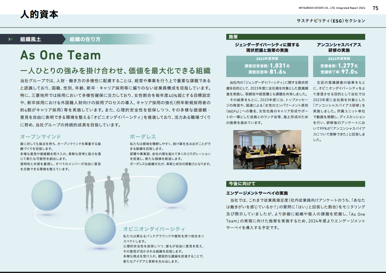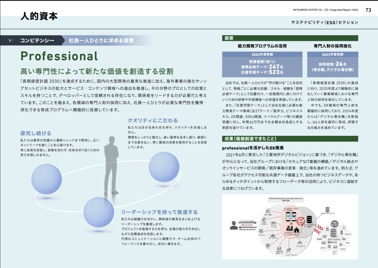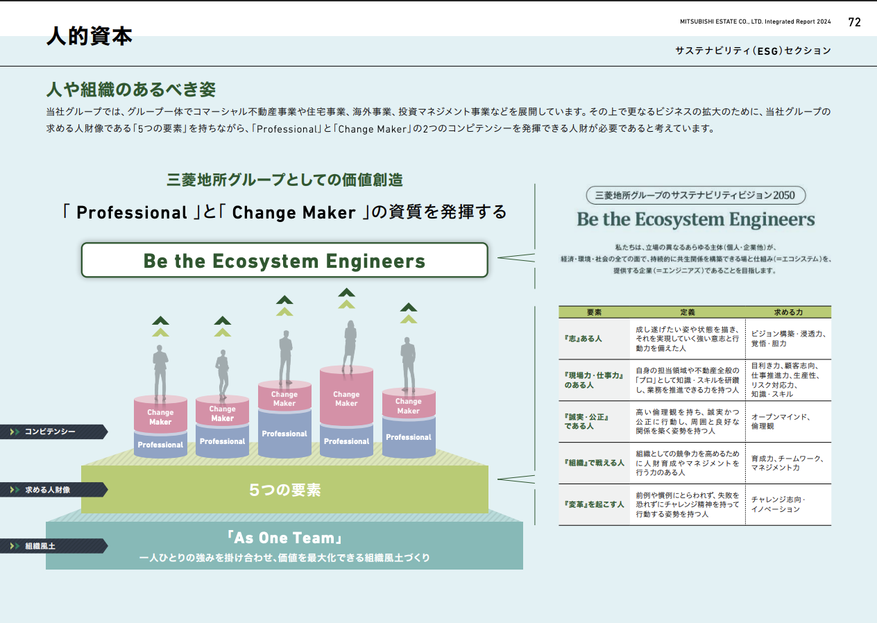 社員一人ひとりの中に「Professional」と「Change Maker」の両方の資質が共存し、「As One Team」の文化のもとで掛け合わされることで、三菱地所グループとしての価値創造が実現する——その人財戦略の全体像を、統合報告書を通じてステークホルダーに明確に届けるページを完成させました。