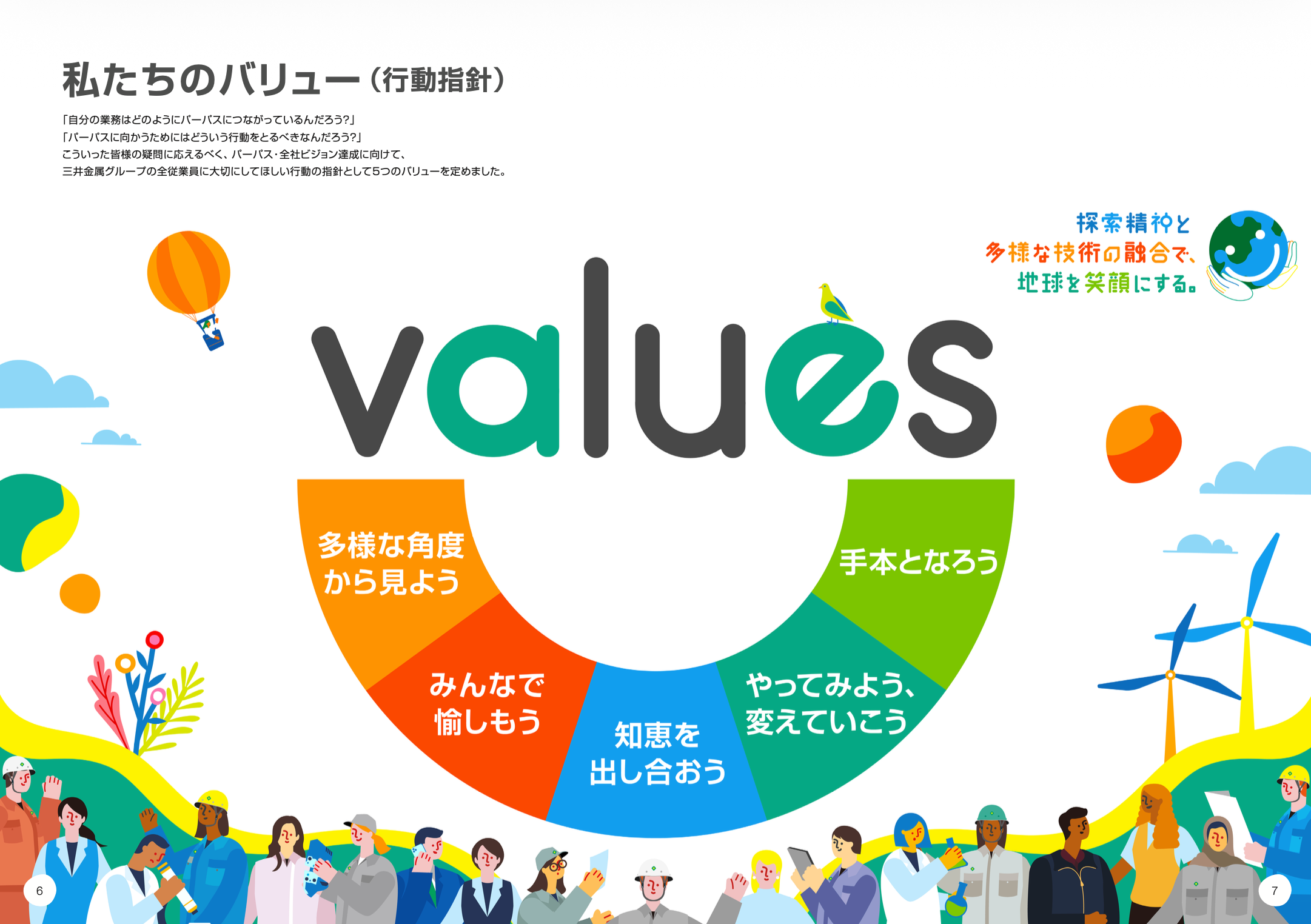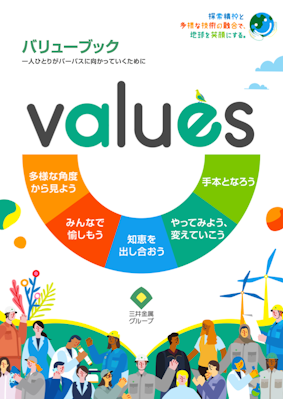バリューは「多様な角度から見よう」「みんなで愉しもう」「知恵を出し合おう」「やってみよう、変えていこう」「手本となろう」の5つ。若手を中心としたプロジェクトチームが、パーパス・全社ビジョン実現のために三井金属グループが備えておくべき組織風土や文化を言語化し、強化すべき行動・価値観と、長年培ってきた「らしさ」を組み合わせて導き出したものです。