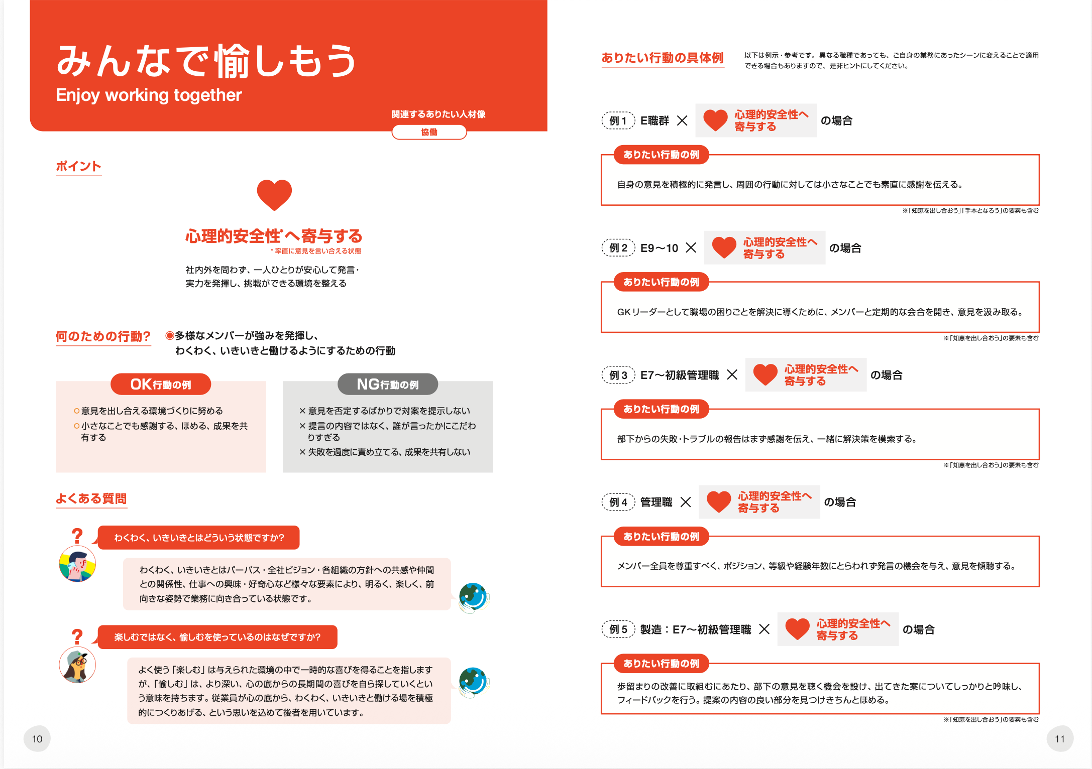 各バリューの見開きページでは、ポイントとなる行動を端的に示した上で、「OK行動の例」「NG行動の例」を具体的に提示。さらに、製造、研究開発、営業、経理、総務など職種別の「ありたい行動の具体例」を多数掲載し、どんな立場の従業員でも自分の業務に引きつけて考えられるよう工夫しています。「よくある質問」コーナーでは、「楽しむではなく愉しむを使っているのはなぜ?」「色々な視点とは具体的にどのような視点?」といった現場から出そうな疑問にも丁寧に回答しています。